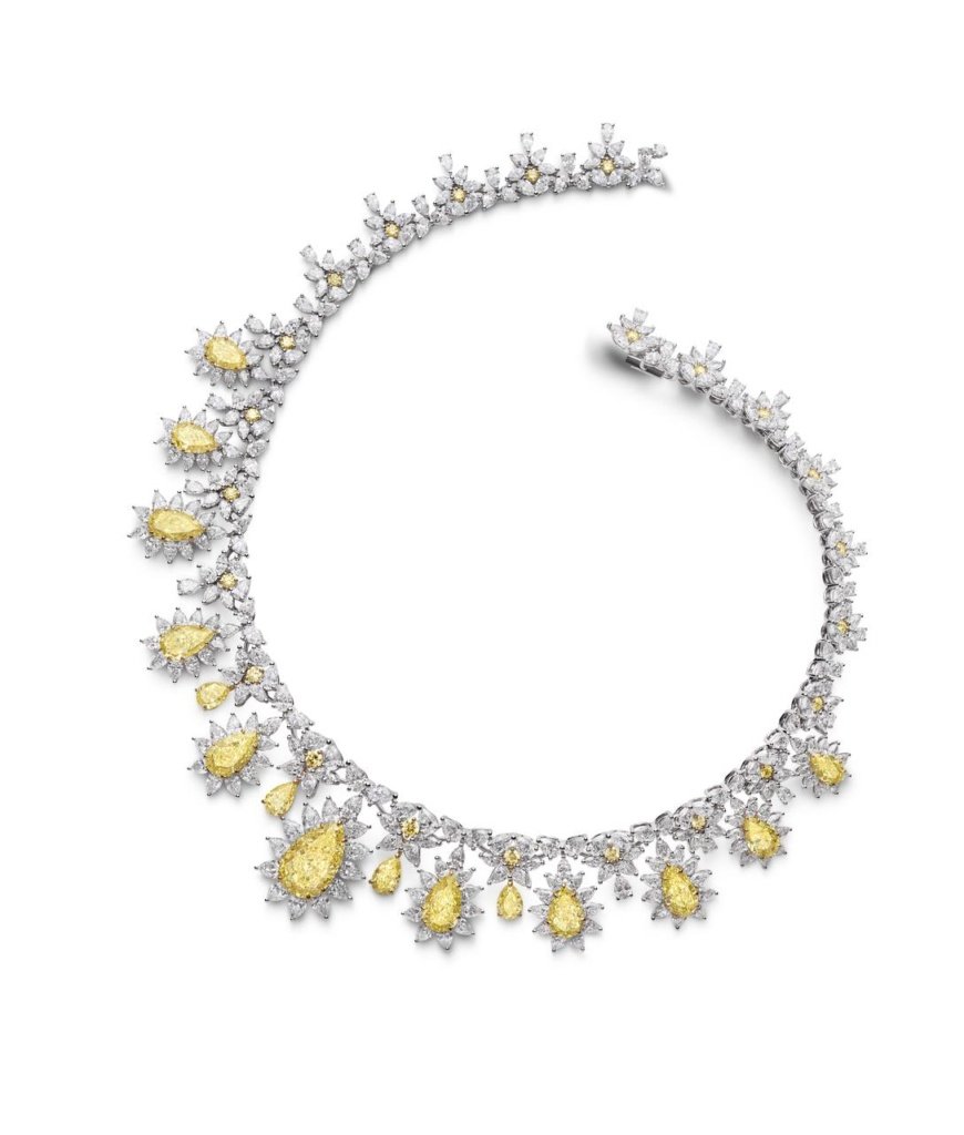 Jessica Chastain. Collar de oro blanco de 18k engastado con diamantes amarillos fancy, diamantes talla pera, marquesa y brillante, y un anillo de oro blanco ético de 18k engastado con un cuarzo rosa talla pera, rubelitas y diamantes.
