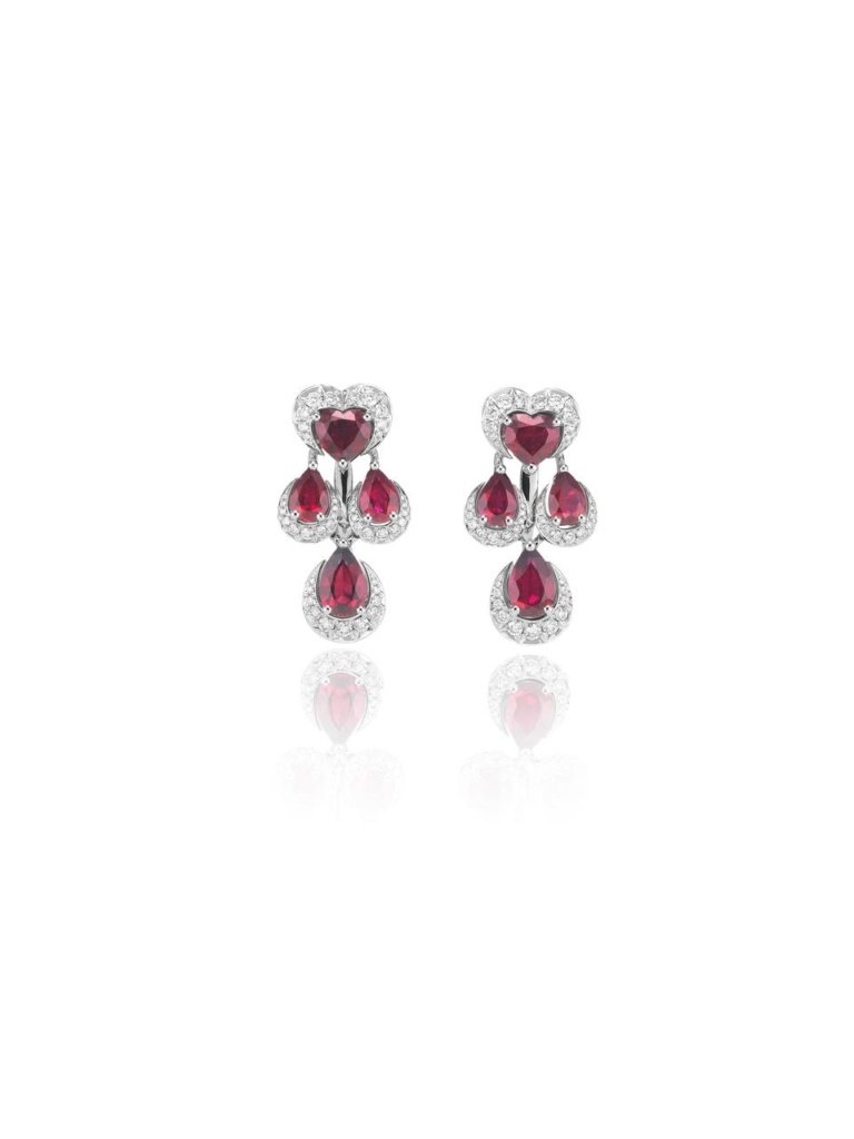 Adriana Lima lleva pendientes de oro blanco ético de 18k engastados de diamantes y rubies de la colección Precious Lace y un anillo de oro blanco ético de 18 k engastado de diamantes de la colección L’Heure du Diamant.
