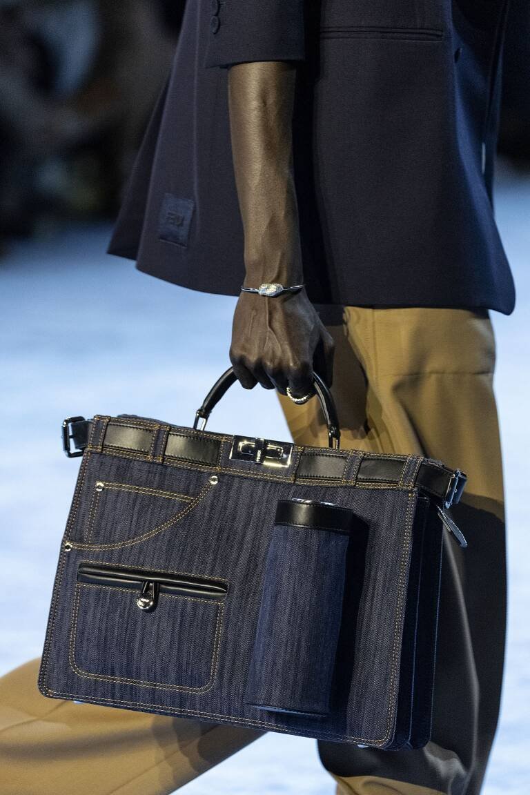 Para la nueva colección, Silvia Venturini Fendi, directora artística de la casa italiana, imaginó un juego de contrastes entre decoración y sencillez. El vestuario de verano evoca viajes a destinos cercanos y lejanos, con una paleta de colores alegres que reflejan la tierra, el mar y el cielo, desde el melón y el índigo hasta el ocre y el gris plateado. Los accesorios incluyen mocasines con flecos de mezclilla y ante, así como viseras. El nuevo bolso bombonera Fendi Roma en toile y cuero presenta un logotipo de Fendi envolvente, mientras que el icónico bolso Peekaboo se reinventa en denim, con un portabotellas integrado. A él se une el primer bolso Peekaboo ISeeU Petit para hombre, en piel de vacuno texturizada o con una correa de cadena de margaritas con pedrería. Explorando el estilo en el punto de apoyo entre la nostalgia y la innovación,