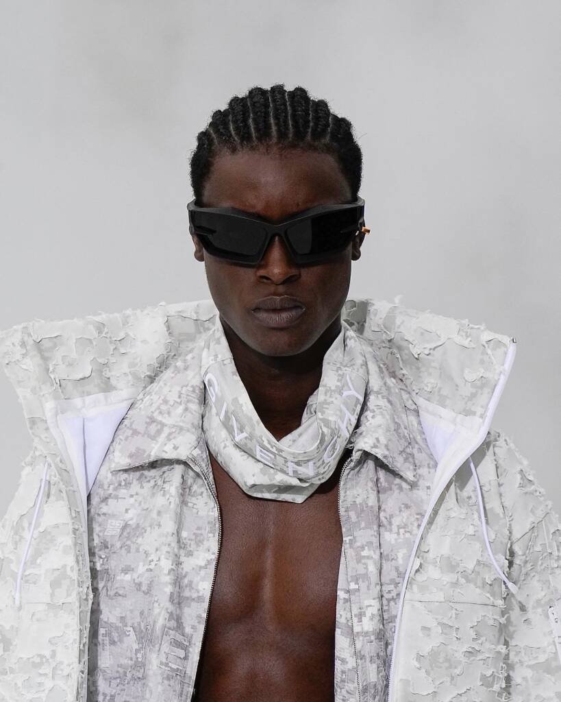 Para su primer desfile Prêt-à-Porter de hombre para Givenchy, presentado en la Ecole Militaire de París, el director creativo Mathew M. Williams investiga los uniformes sociales de su América natal para crear un vestuario contemporáneo, aplicando el saber hacer de los talleres de París. . Emerge una nueva silueta marcadamente entallada con abrigos negros y grises y chaquetas exteriores confeccionadas en cuero ultraligero. Una sensibilidad excedente militar infunde piezas con chaquetas, chalecos tácticos y pantalones cargo con motivos de camuflaje impresos digitalmente sobre tela impermeable. El juego de telas también incluye piezas hechas de un mosaico de recortes de cuero reciclado laminados para una apariencia súper lujosa. Con esta colección, Mathew M. Williams crea ropa contemporánea a través de la lente de la refinada elegancia de Givenchy.