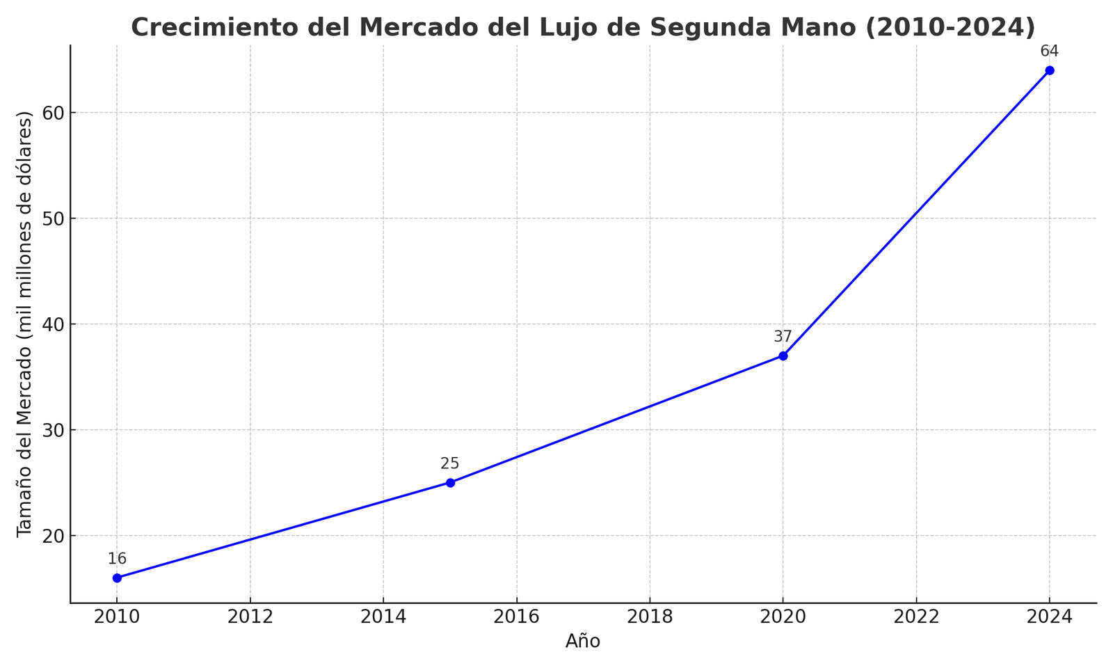 En la última década, el mercado del lujo de segunda mano ha crecido exponencialmente. Según un informe de Bain & Company, se espera que el mercado global de artículos de lujo de segunda mano alcance los 64 mil millones de dólares para 2025, con una tasa de crecimiento anual compuesta (CAGR) del 10-15%.