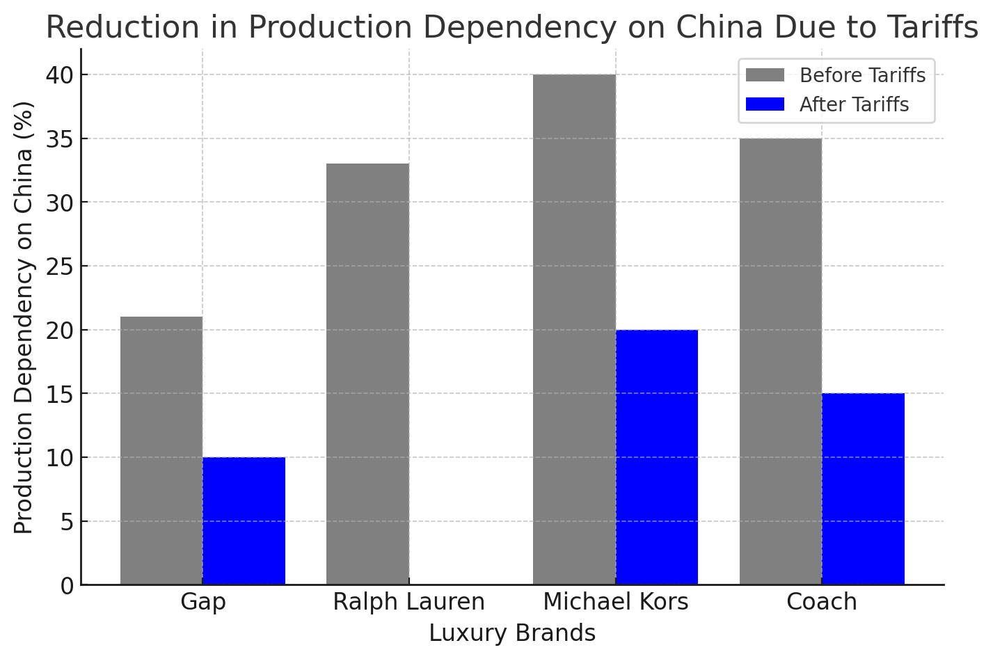 Companies such as Ralph Lauren, Michael Kors, and Coach have reduced their dependence on manufacturing in China, shifting some production to lower-cost countries. Below are some strategies adopted: